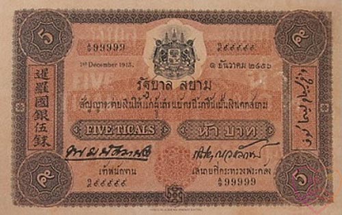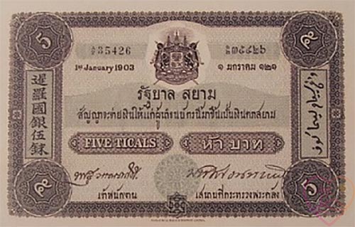 История сиамских бумажных денег началась с банкноты 5 бат Типа 1. Четыре выпуска, плоская печать, водяные знаки и отражение трех культур — китайской, малайской и сиамской — в дизайне одной банкноты.